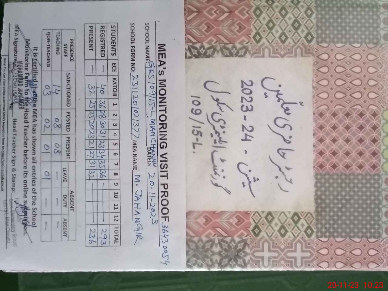 | Monitoring Date: 20-11-2023 | Start Time: 20-11-2023 09:11 AM | End Time: 20-11-2023 10:33 AM | Name of MEA: Mu**** Ja**** | |