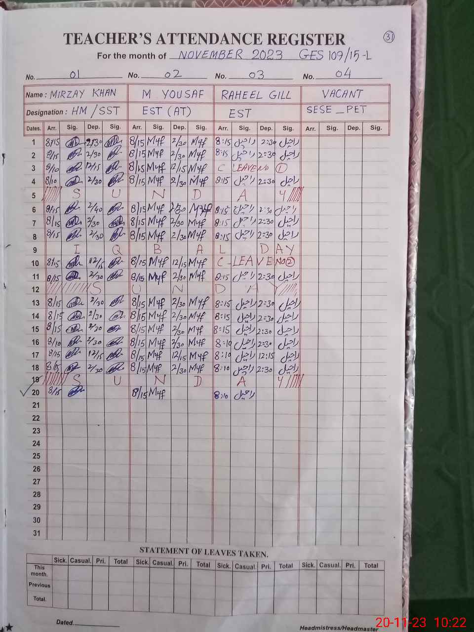 | CNIC | Full Name | Designation | R/C | Absence During Last Calender Month |