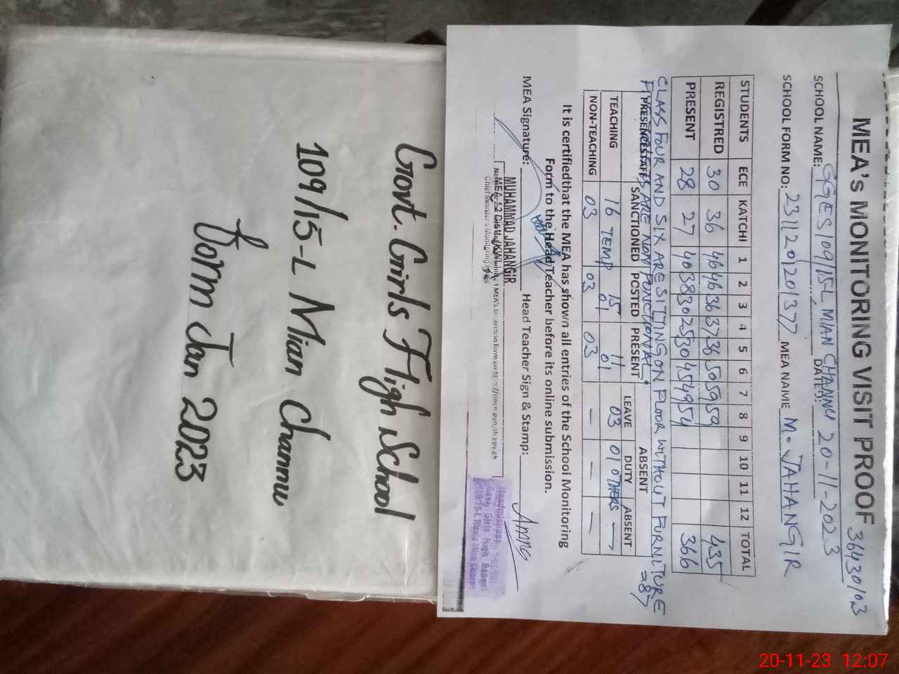 | Attendance Register | Head Teacher | MEA with School | Visit Proof |