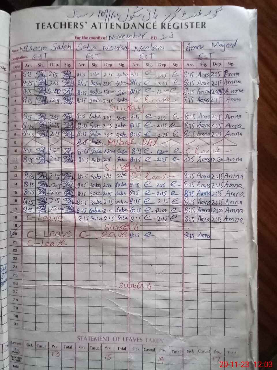 | CNIC | Full Name | Designation | R/C | Absence During Last Calender Month |