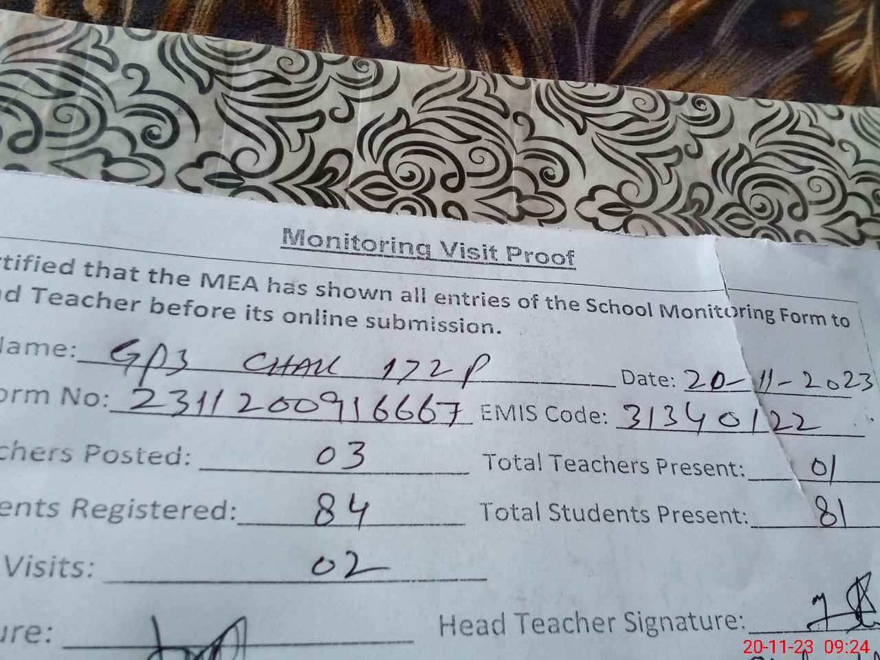 | Attendance Register | Head Teacher | MEA with School | Visit Proof |
