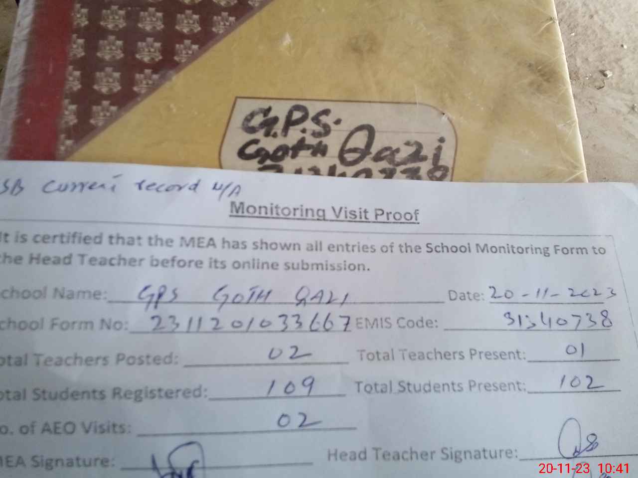 | Attendance Register | Head Teacher | MEA with School | Visit Proof |