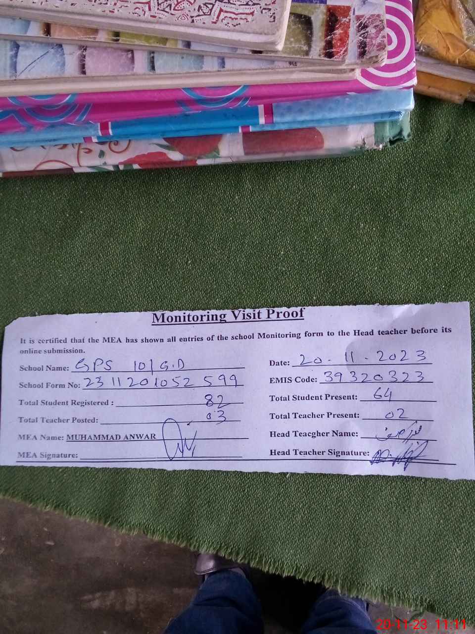 | Attendance Register | Head Teacher | MEA with School | Visit Proof |