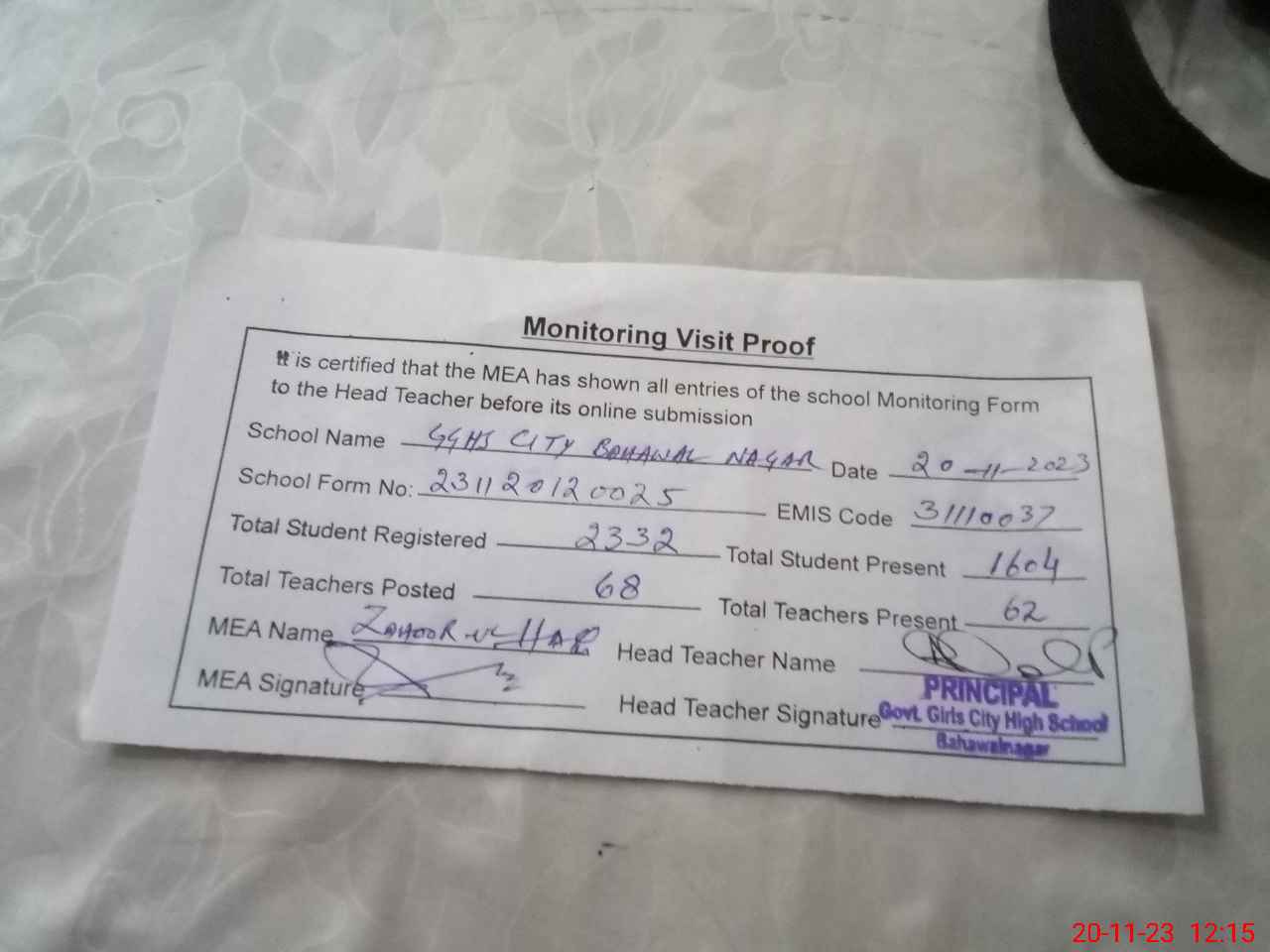 | Monitoring Date: 20-11-2023 | Start Time: 20-11-2023 11:15 AM | End Time: 20-11-2023 12:22 PM | Name of MEA: Za**** BN**** | |