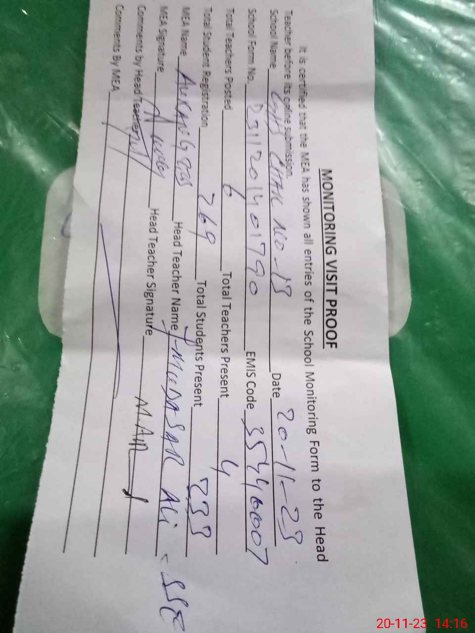 | Attendance Register | Head Teacher | MEA with School | Visit Proof |