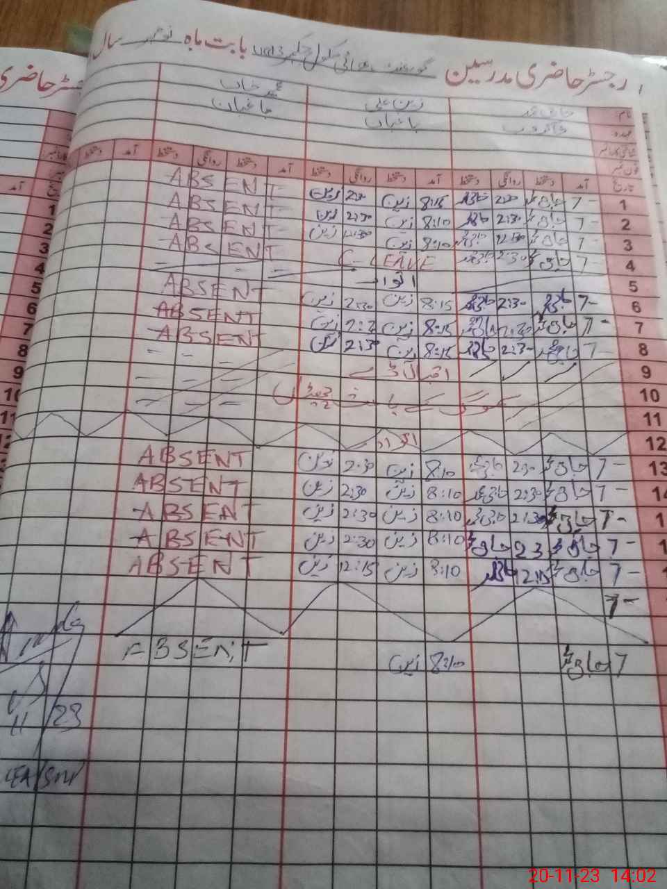 | CNIC | Full Name | Designation | R/C | Absence During Last Calender Month |