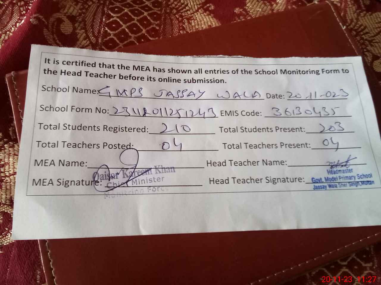 | Attendance Register | Head Teacher | MEA with School | Visit Proof |