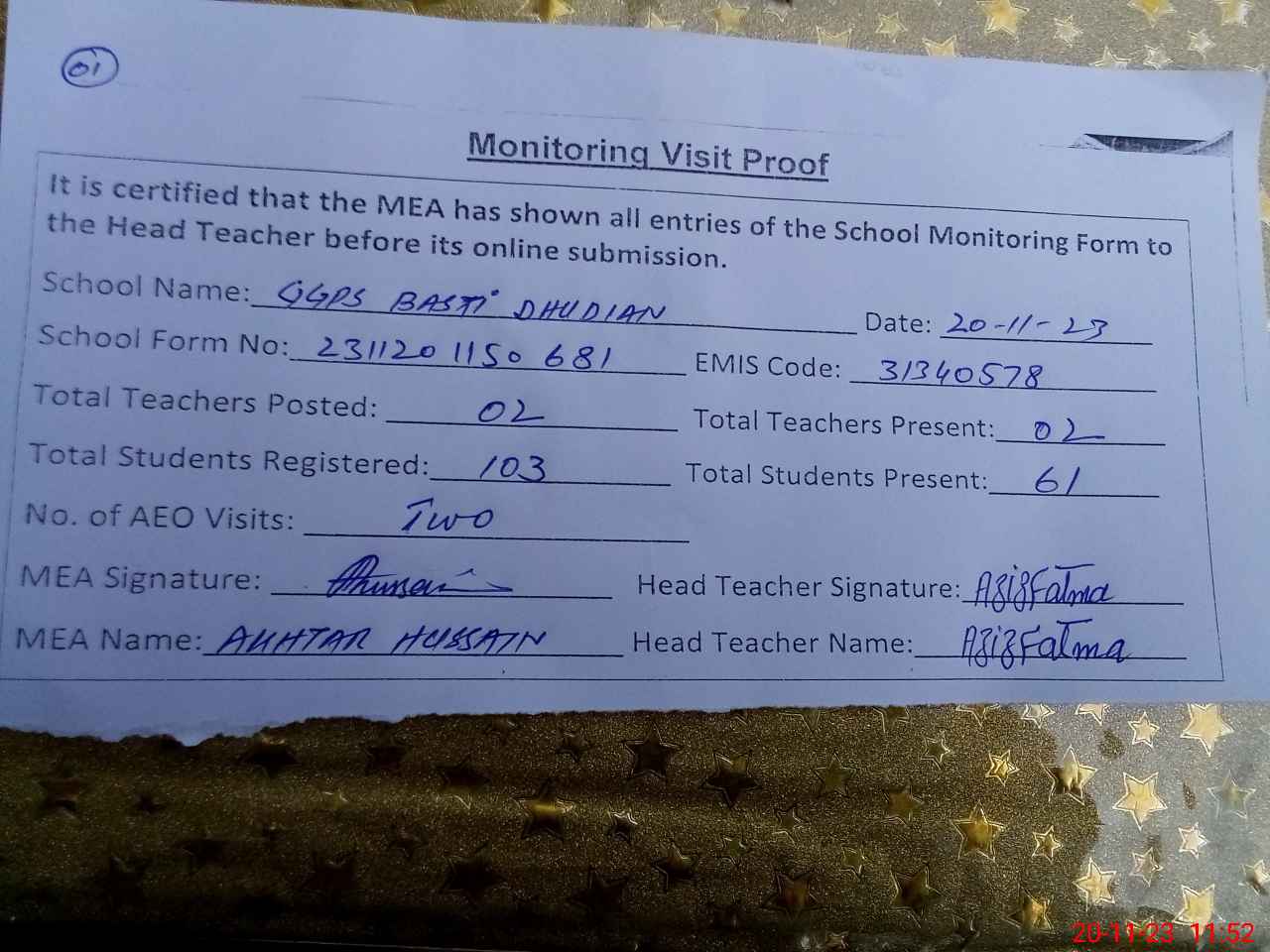 | Attendance Register | Head Teacher | MEA with School | Visit Proof |