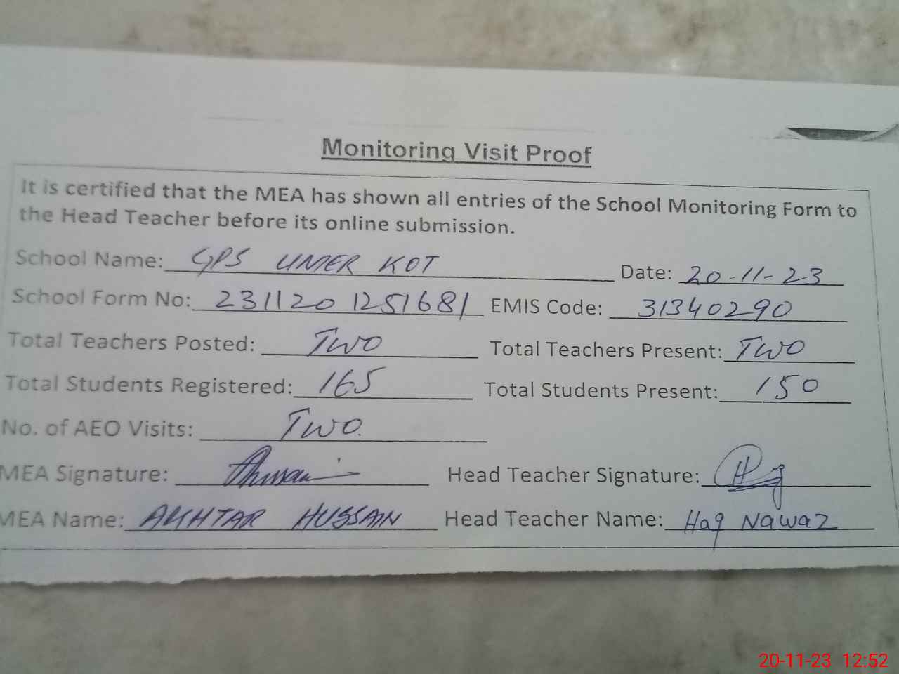 | Attendance Register | Head Teacher | MEA with School | Visit Proof |
