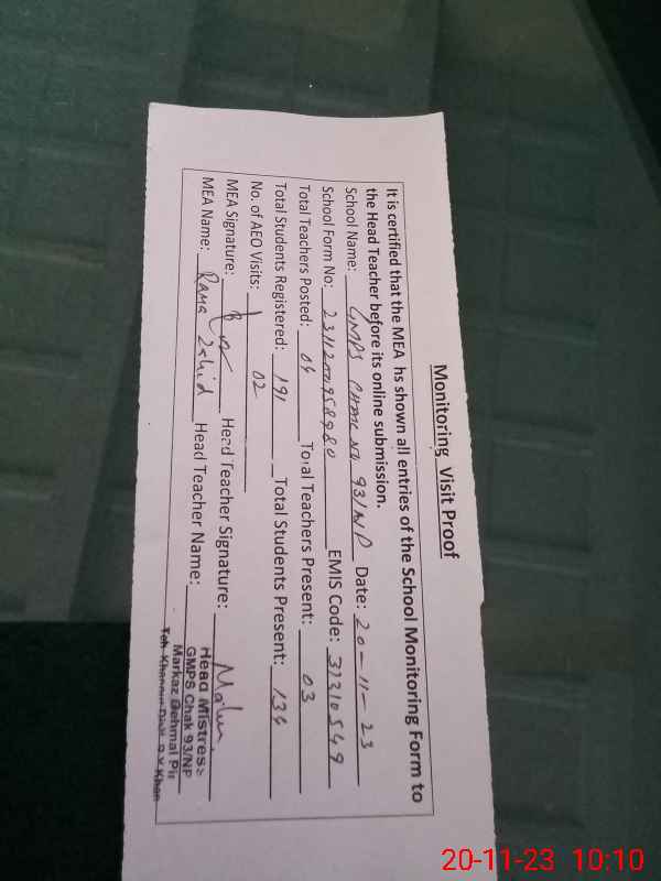 | EMIS Code: 31310549 | Name of School: GMPS CHAK NO. 93/NP (After Noon) | |||