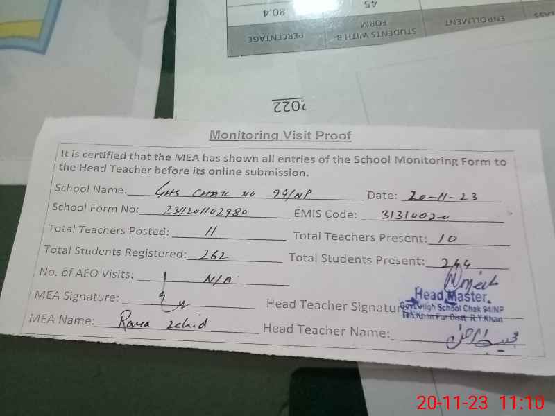 | EMIS Code: 31310020 | Name of School: GHS CHAK NO 94 NP | |||