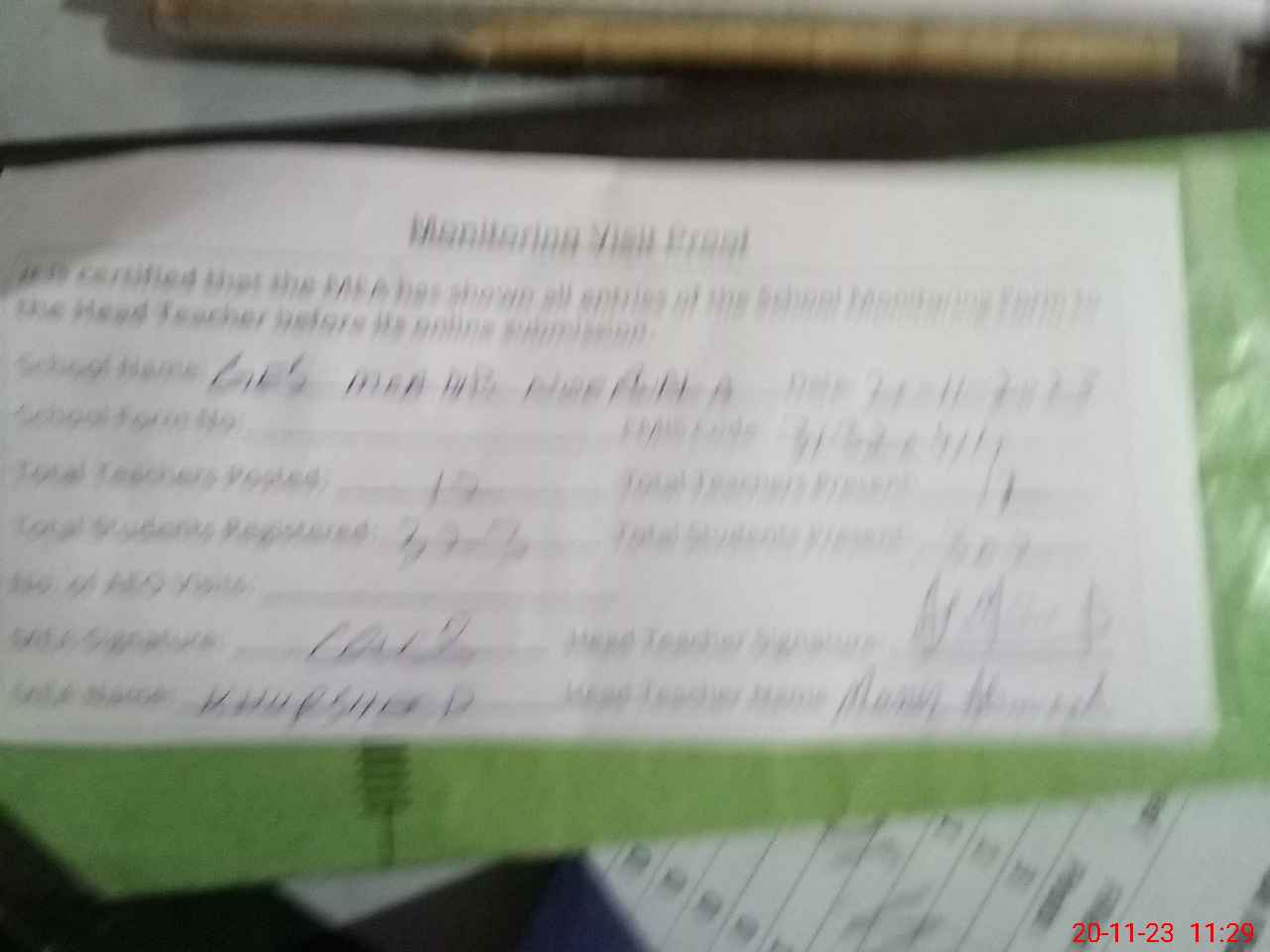 | Attendance Register | Head Teacher | MEA with School | Visit Proof |