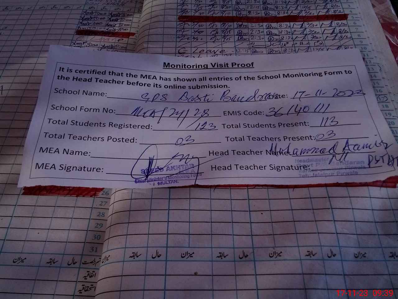 | Attendance Register | Head Teacher | MEA with School | Visit Proof |