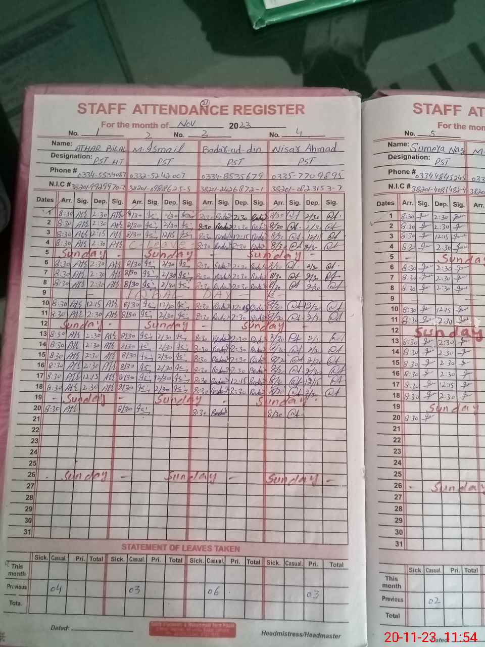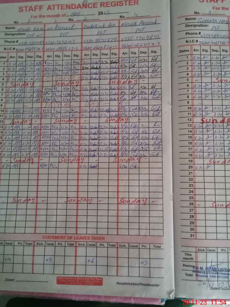 | CNIC | Full Name | Designation | R/C | Absence During Last Calender Month |