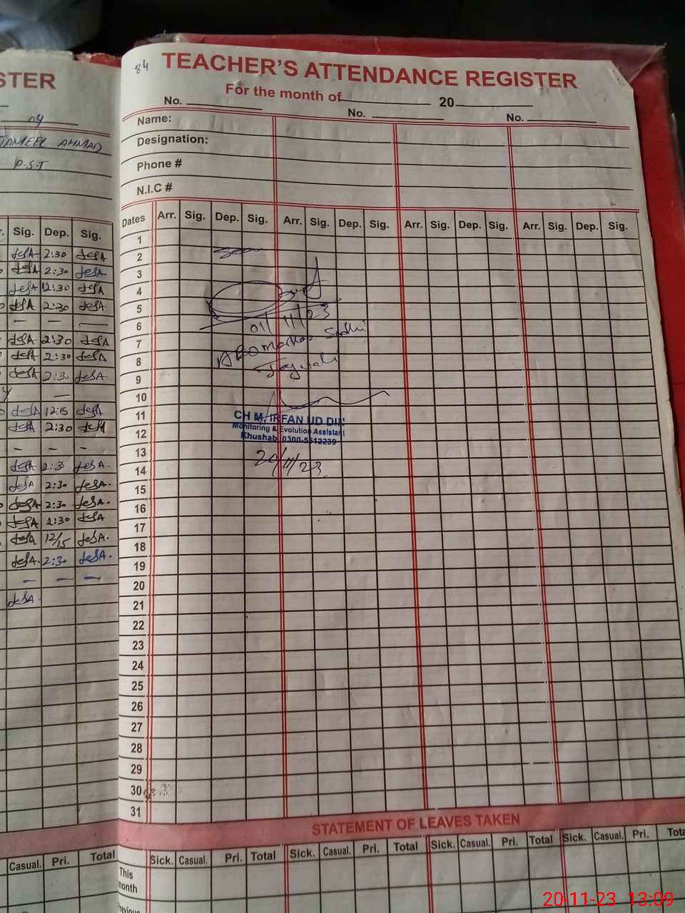 | CNIC | Full Name | Designation | R/C | Absence During Last Calender Month |