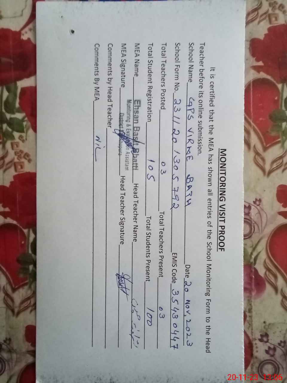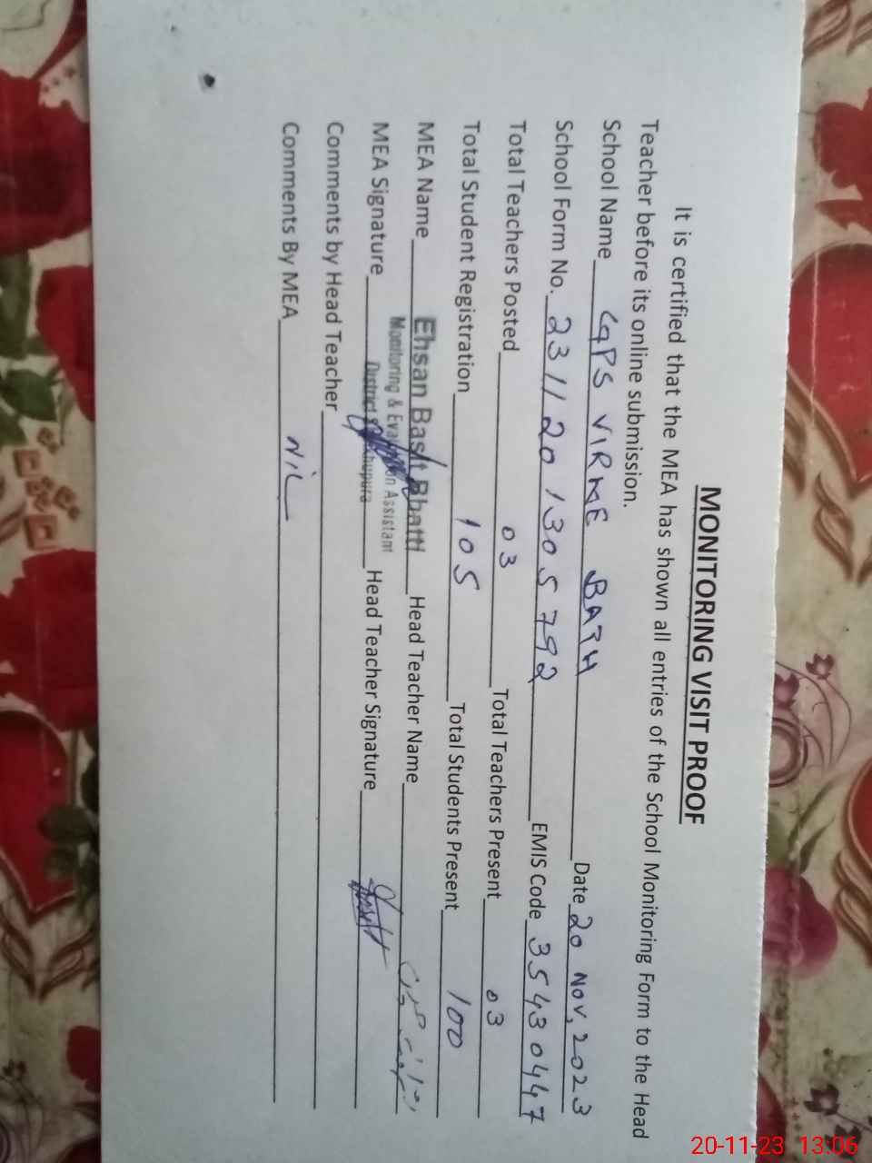 | Attendance Register | Head Teacher | MEA with School | Visit Proof |