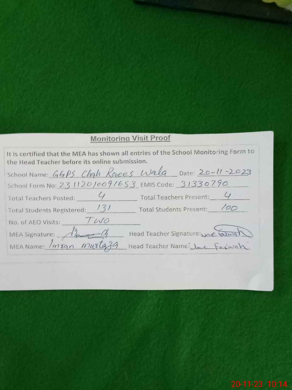 | EMIS Code: 31330790 | Name of School: GGPS CHAH RAEES WALA | |||