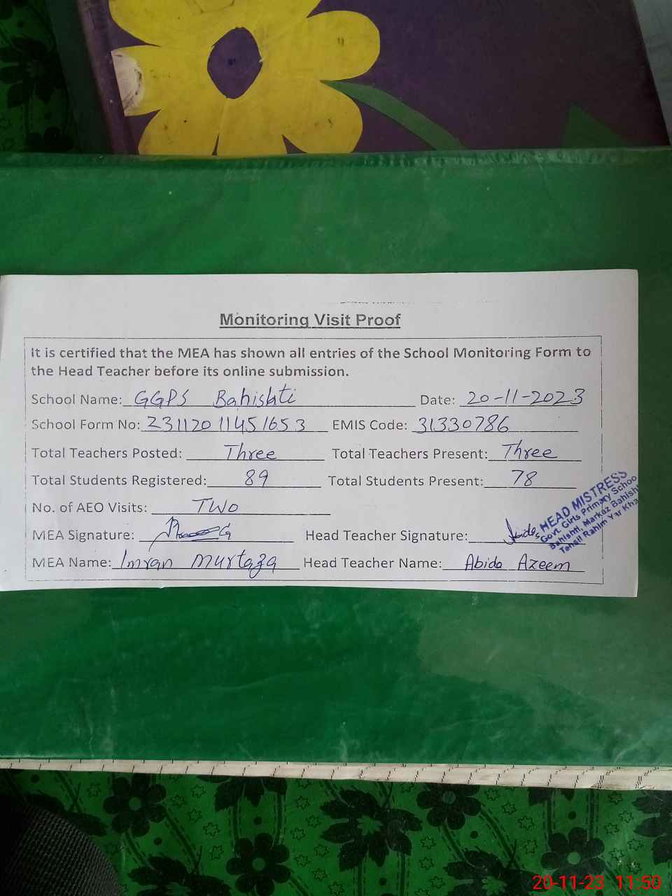 | Attendance Register | Head Teacher | MEA with School | Visit Proof |