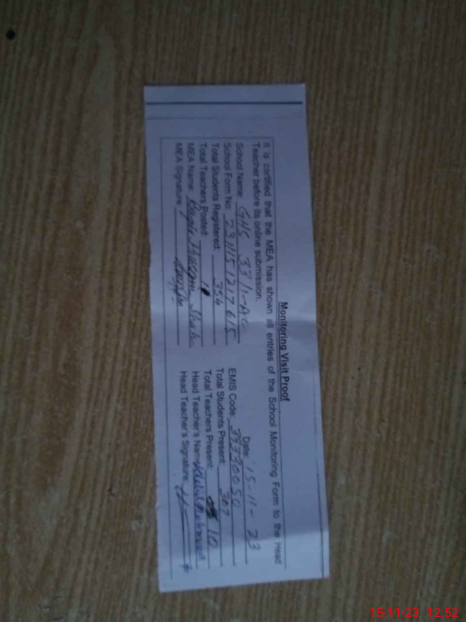 | Attendance Register | Head Teacher | MEA with School | Visit Proof |