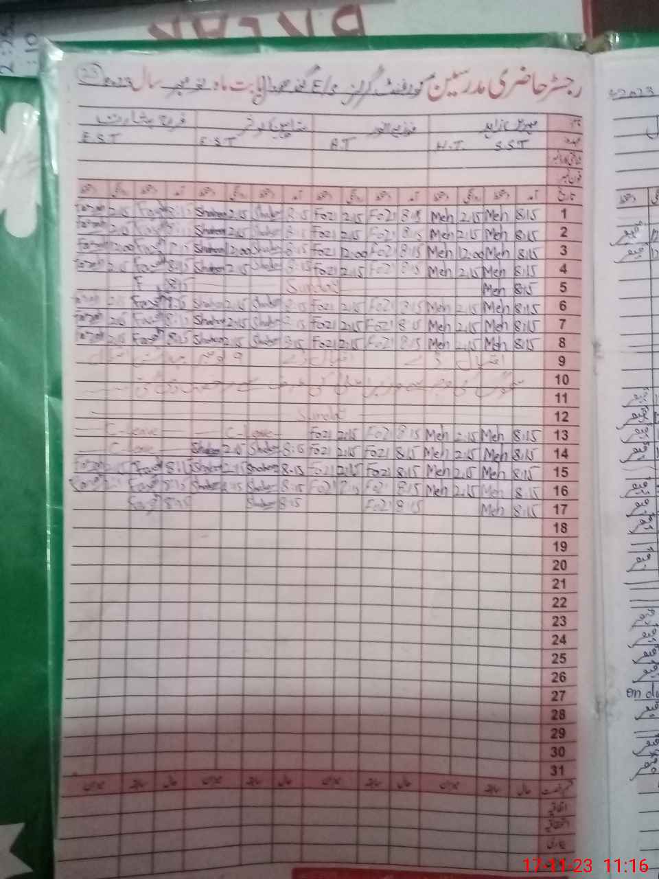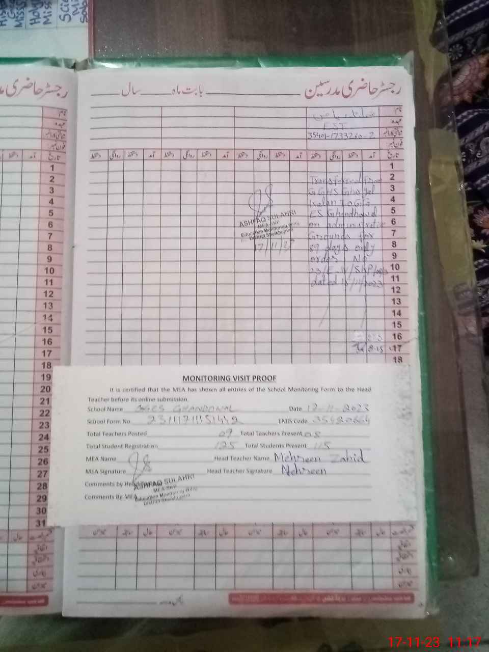| Attendance Register | Head Teacher | MEA with School | Visit Proof |
