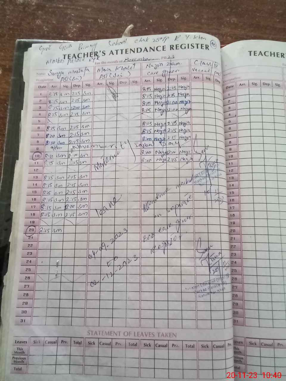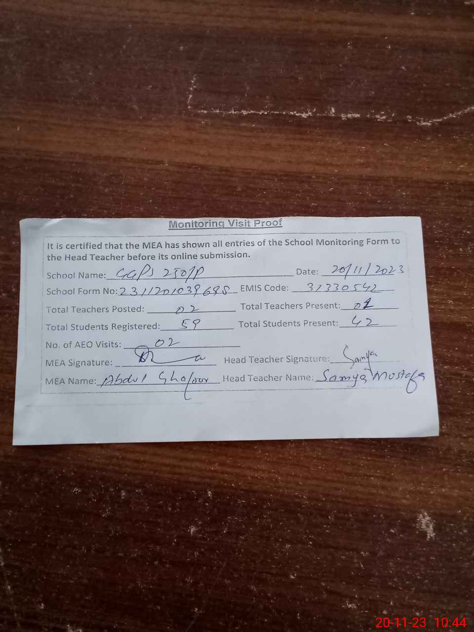 | Attendance Register | Head Teacher | MEA with School | Visit Proof |
