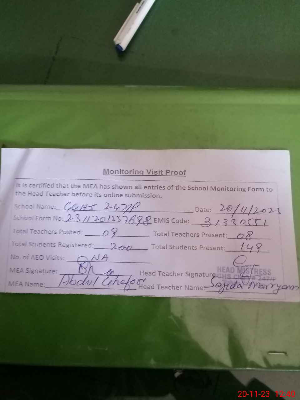 | Attendance Register | Head Teacher | MEA with School | Visit Proof |