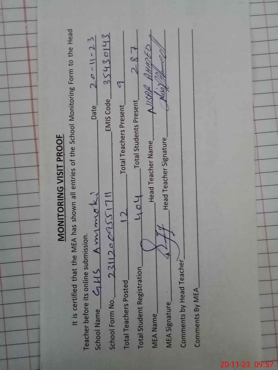 | Attendance Register | Head Teacher | MEA with School | Visit Proof |
