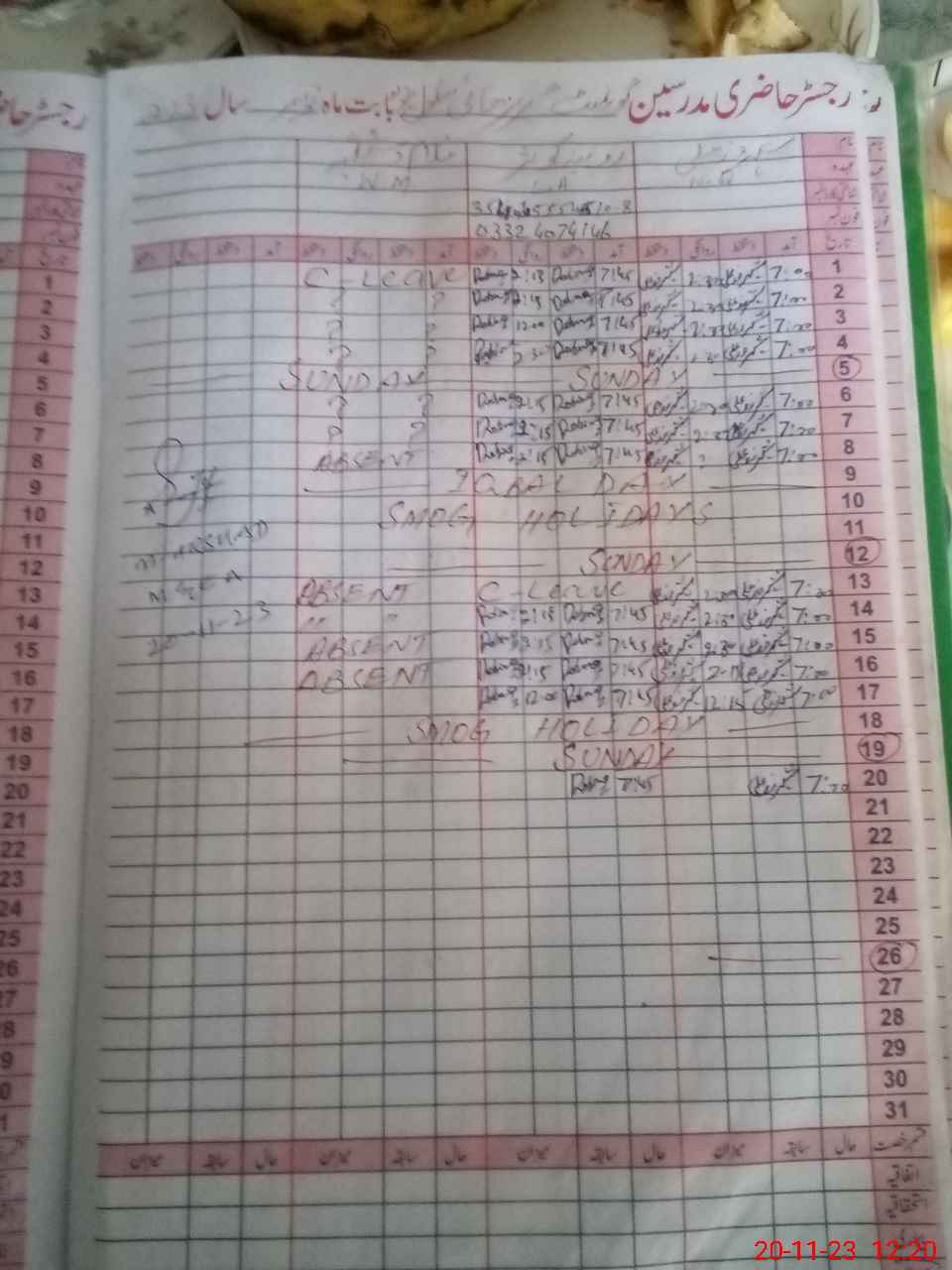 | CNIC | Full Name | Designation | R/C | Absence During Last Calender Month |