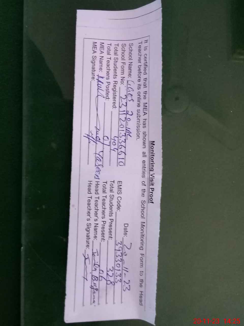 | Attendance Register | Head Teacher | MEA with School | Visit Proof |