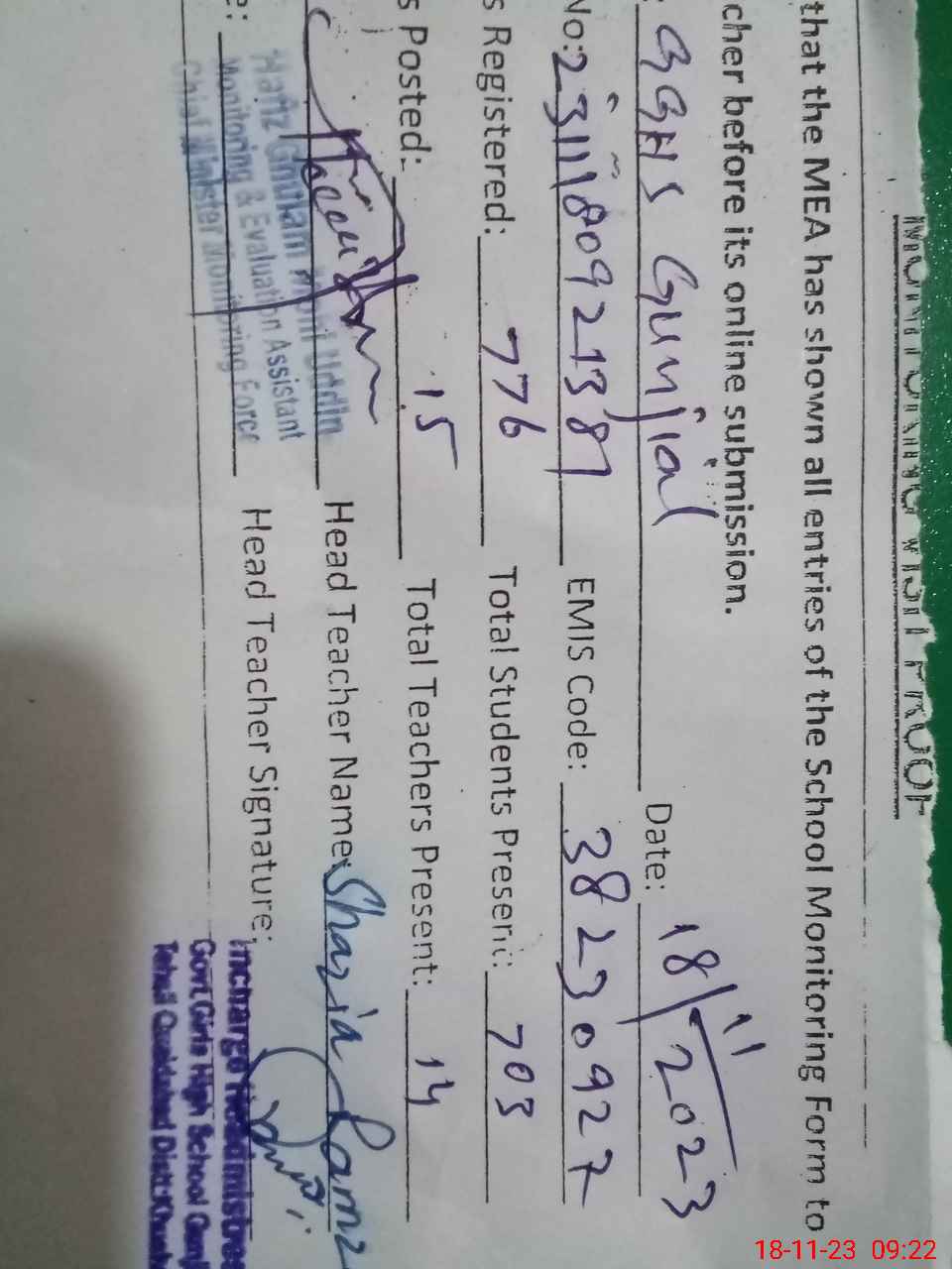 | EMIS Code: 38230927 | Name of School: GGHS GUNJIAL | |||