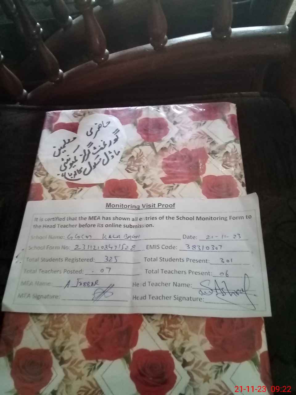 | Attendance Register | Head Teacher | MEA with School | Visit Proof |