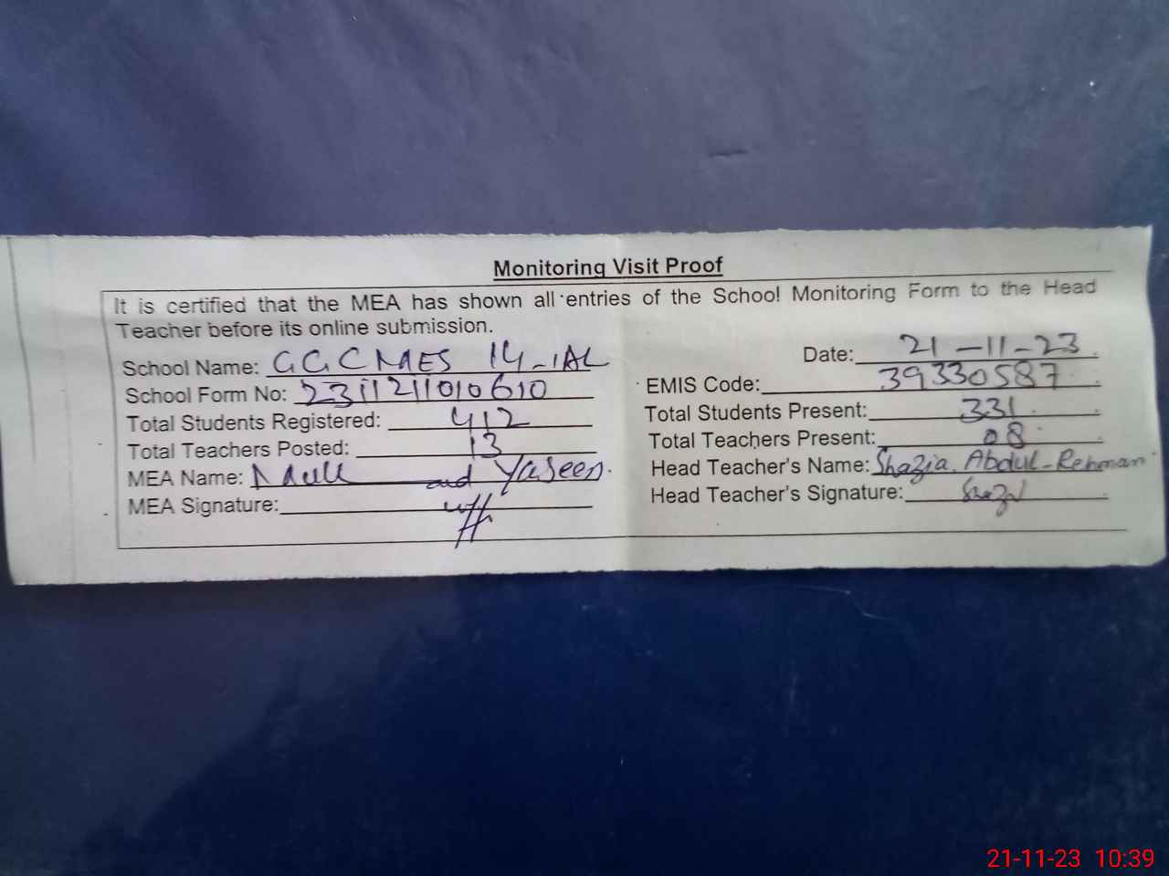 | Attendance Register | Head Teacher | MEA with School | Visit Proof |