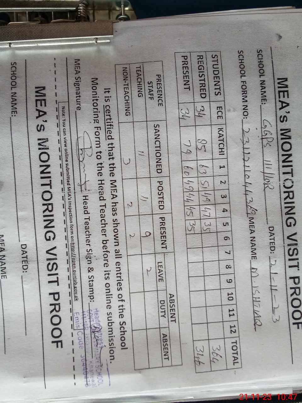| Attendance Register | Head Teacher | MEA with School | Visit Proof |