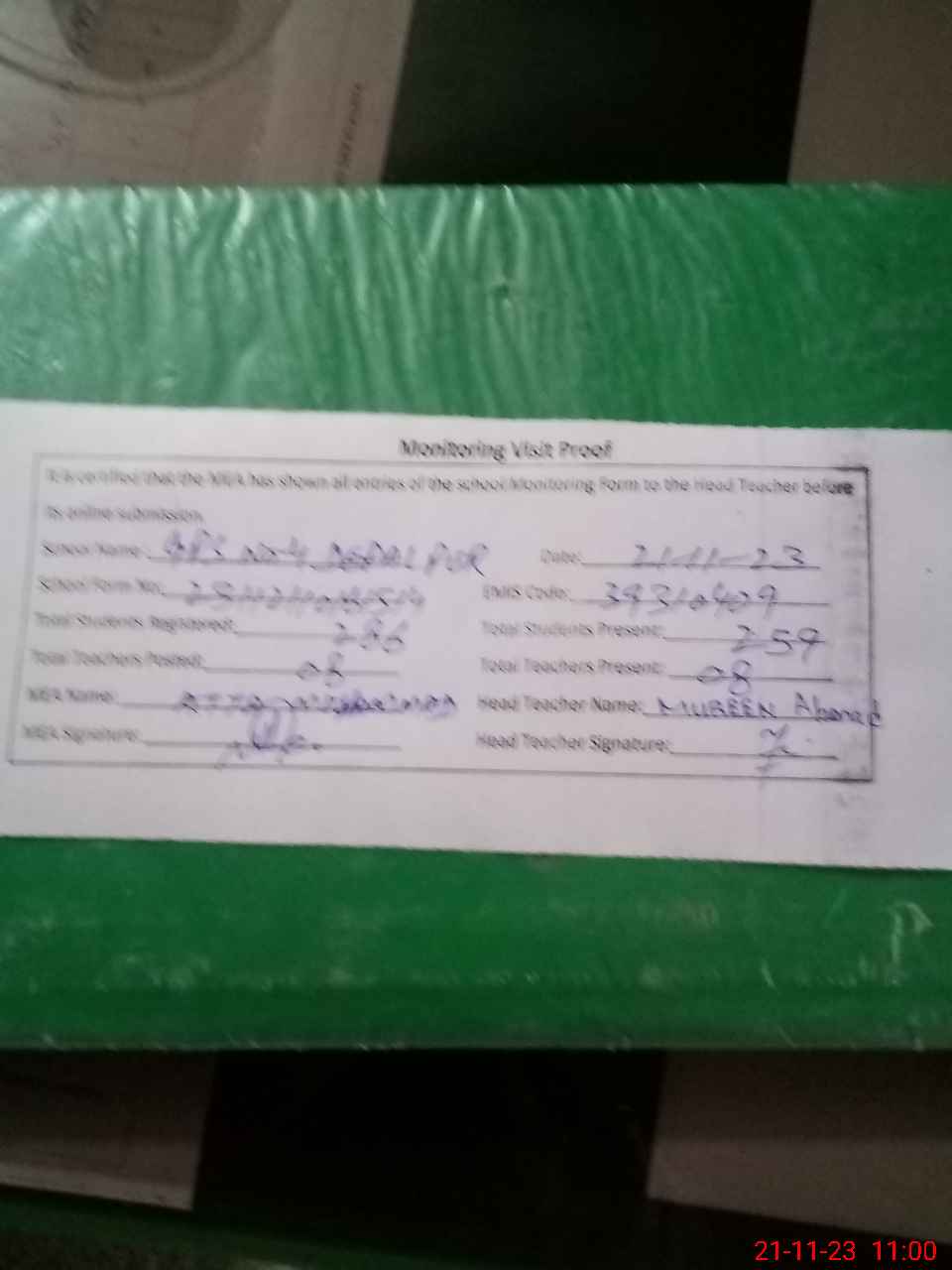 | Attendance Register | Head Teacher | MEA with School | Visit Proof |