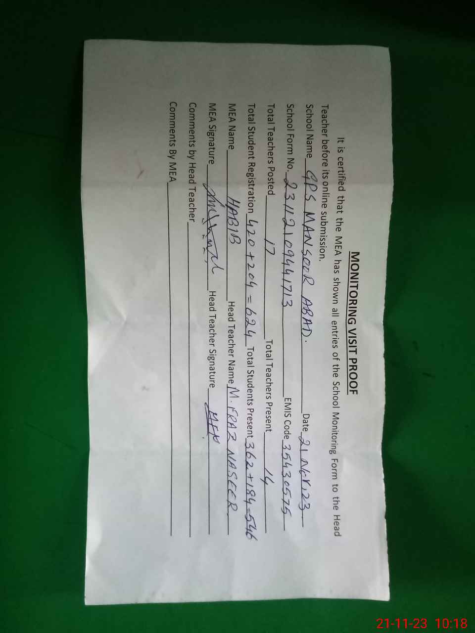 | EMIS Code: 35430575 | Name of School: GPS MANSOOR ABAD | |||