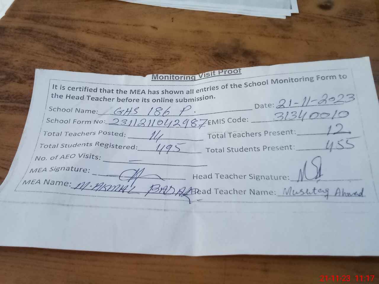| EMIS Code: 31340010 | Name of School: GHS CHAK 186/P | |||