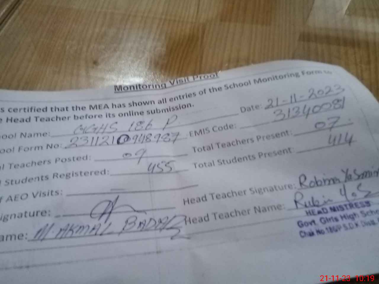 | Attendance Register | Head Teacher | MEA with School | Visit Proof |