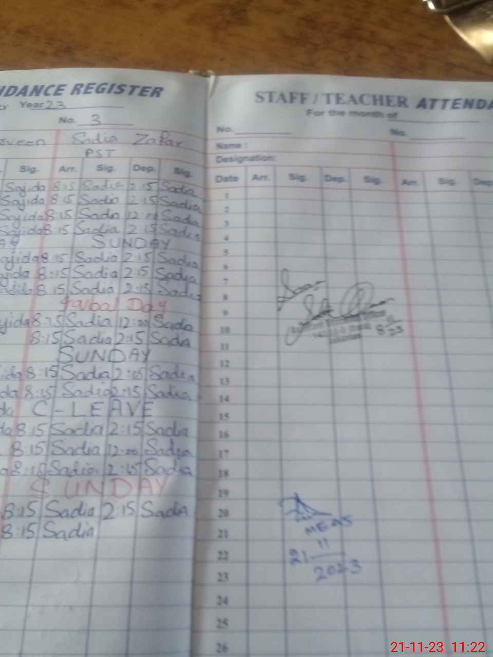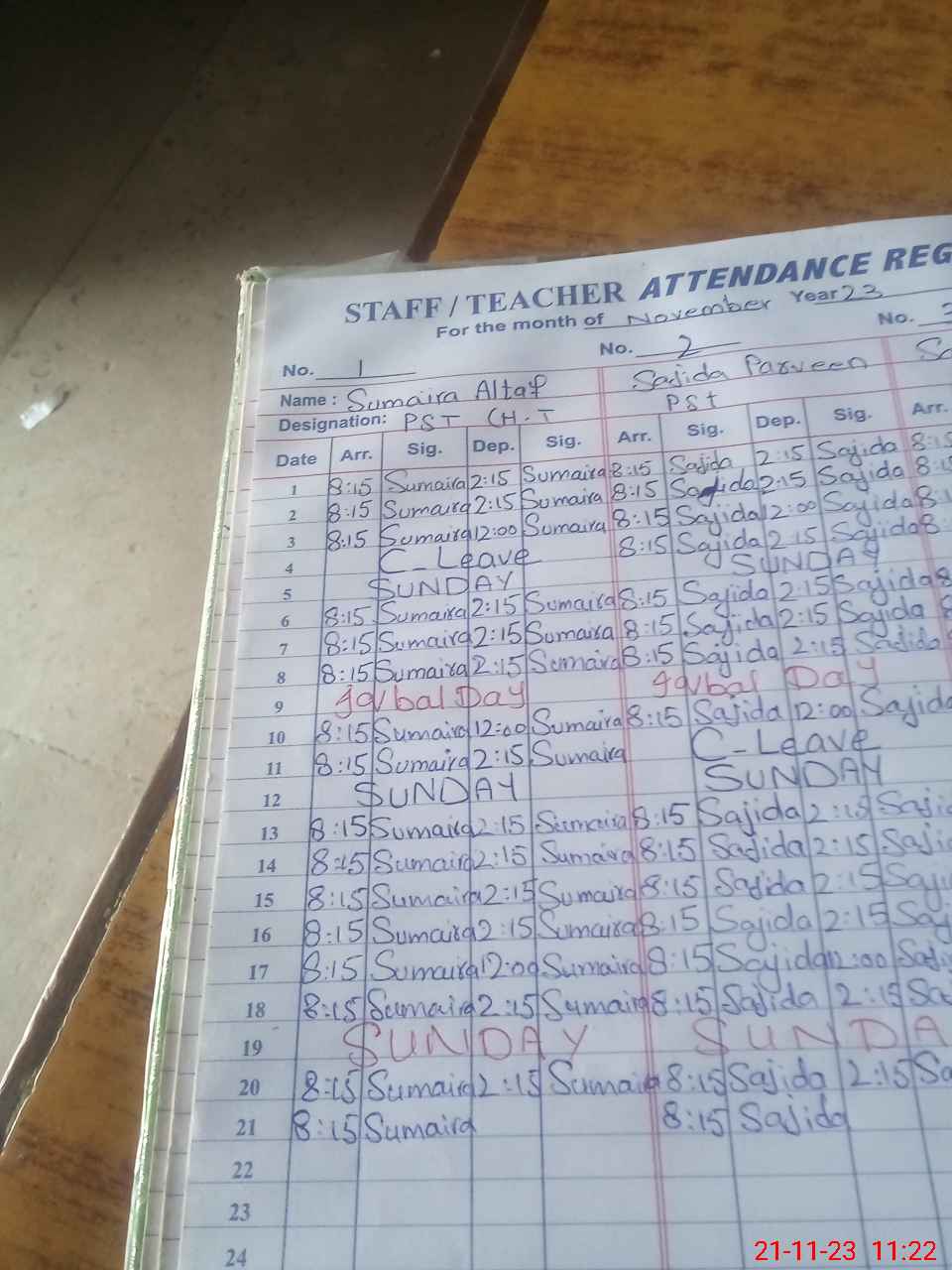 | CNIC | Full Name | Designation | R/C | Absence During Last Calender Month |
