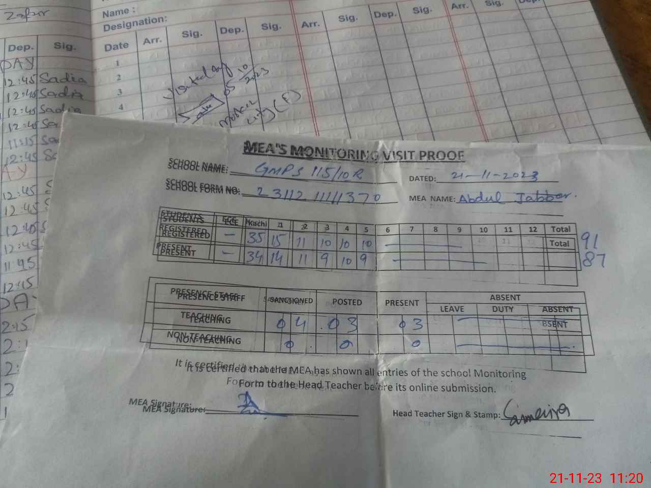 | Attendance Register | Head Teacher | MEA with School | Visit Proof |