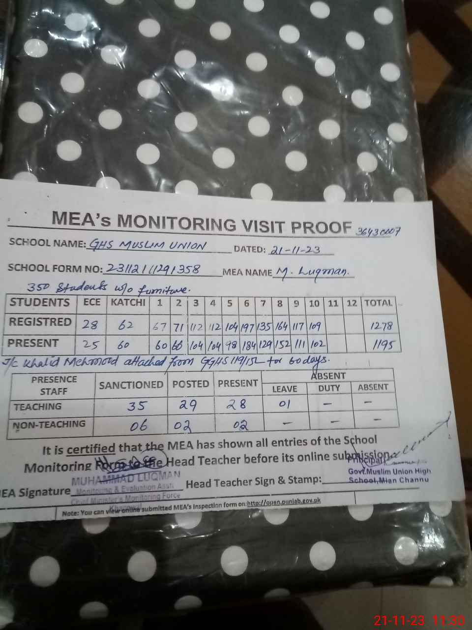 | EMIS Code: 36430007 | Name of School: GHS MUSLIM UNION MIAN CHANNU, MIAN CHANNU | |||