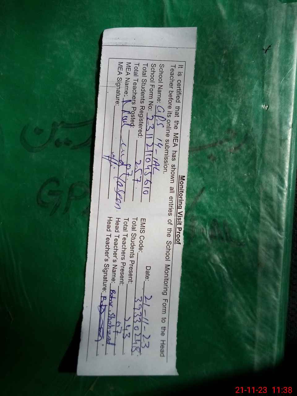 | Attendance Register | Head Teacher | MEA with School | Visit Proof |