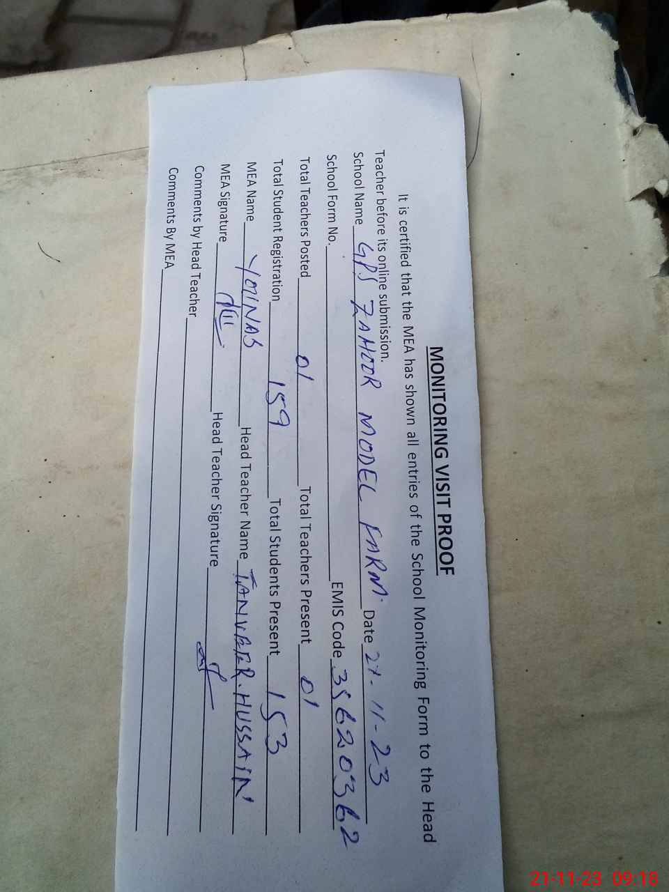| Attendance Register | Head Teacher | MEA with School | Visit Proof |