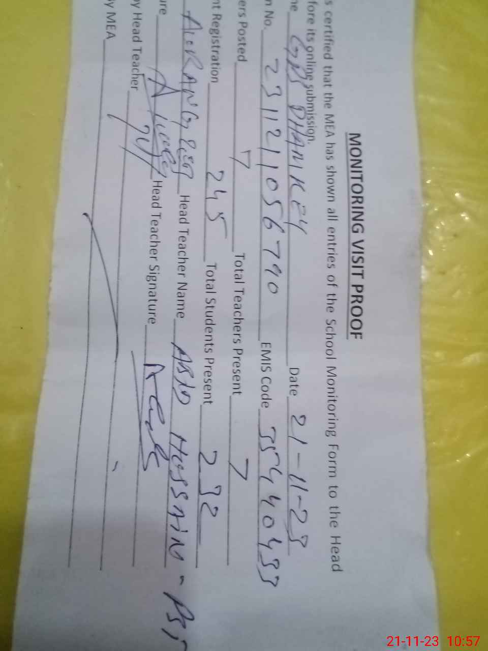 | Attendance Register | Head Teacher | MEA with School | Visit Proof |