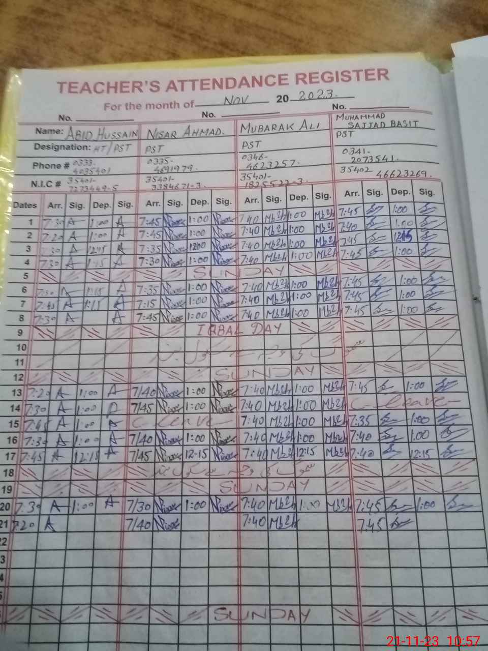 | CNIC | Full Name | Designation | R/C | Absence during last cal. month |
