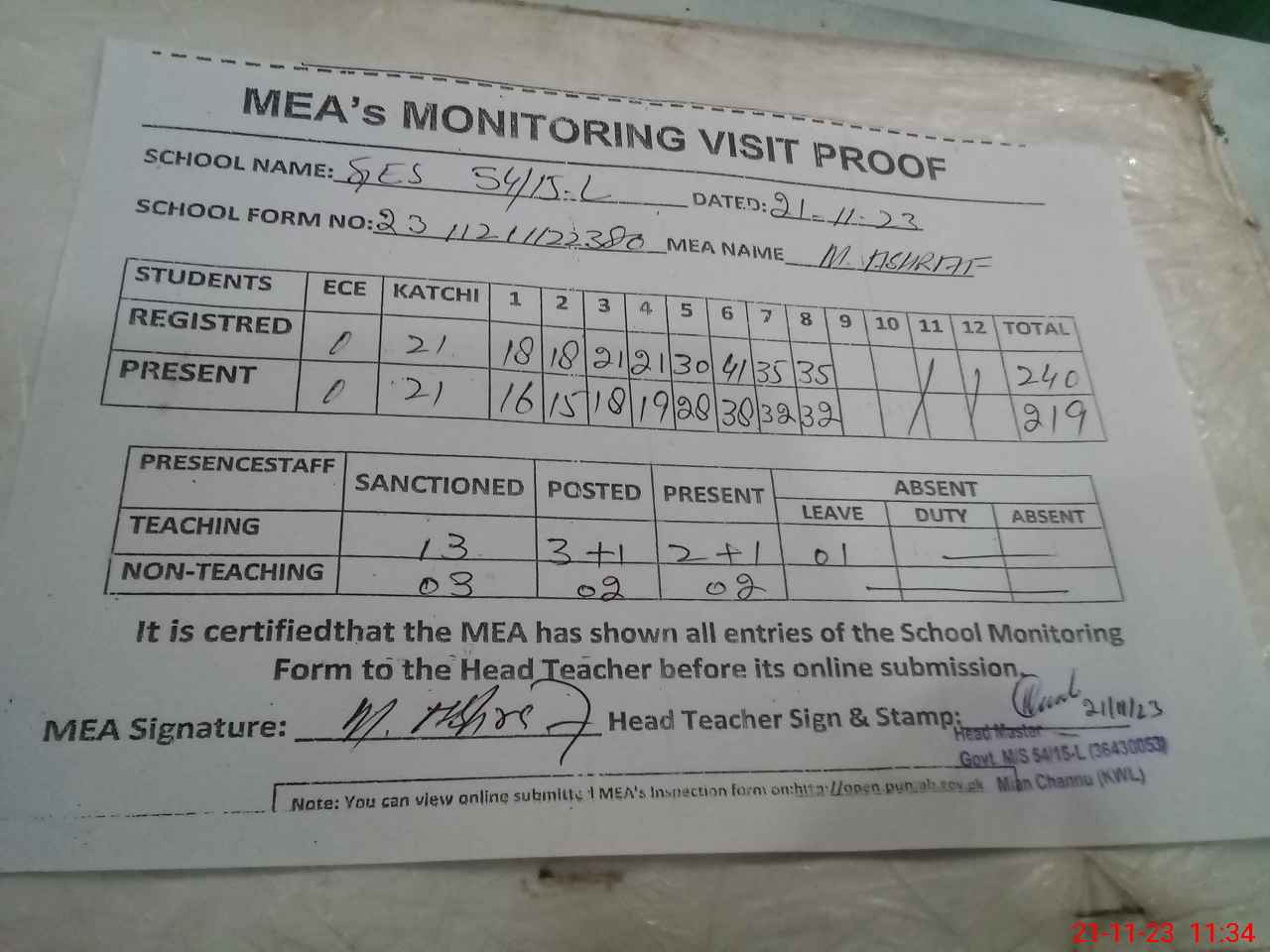 | EMIS Code: 36430053 | Name of School: GES 54/15-L, MIAN CHANNU | |||