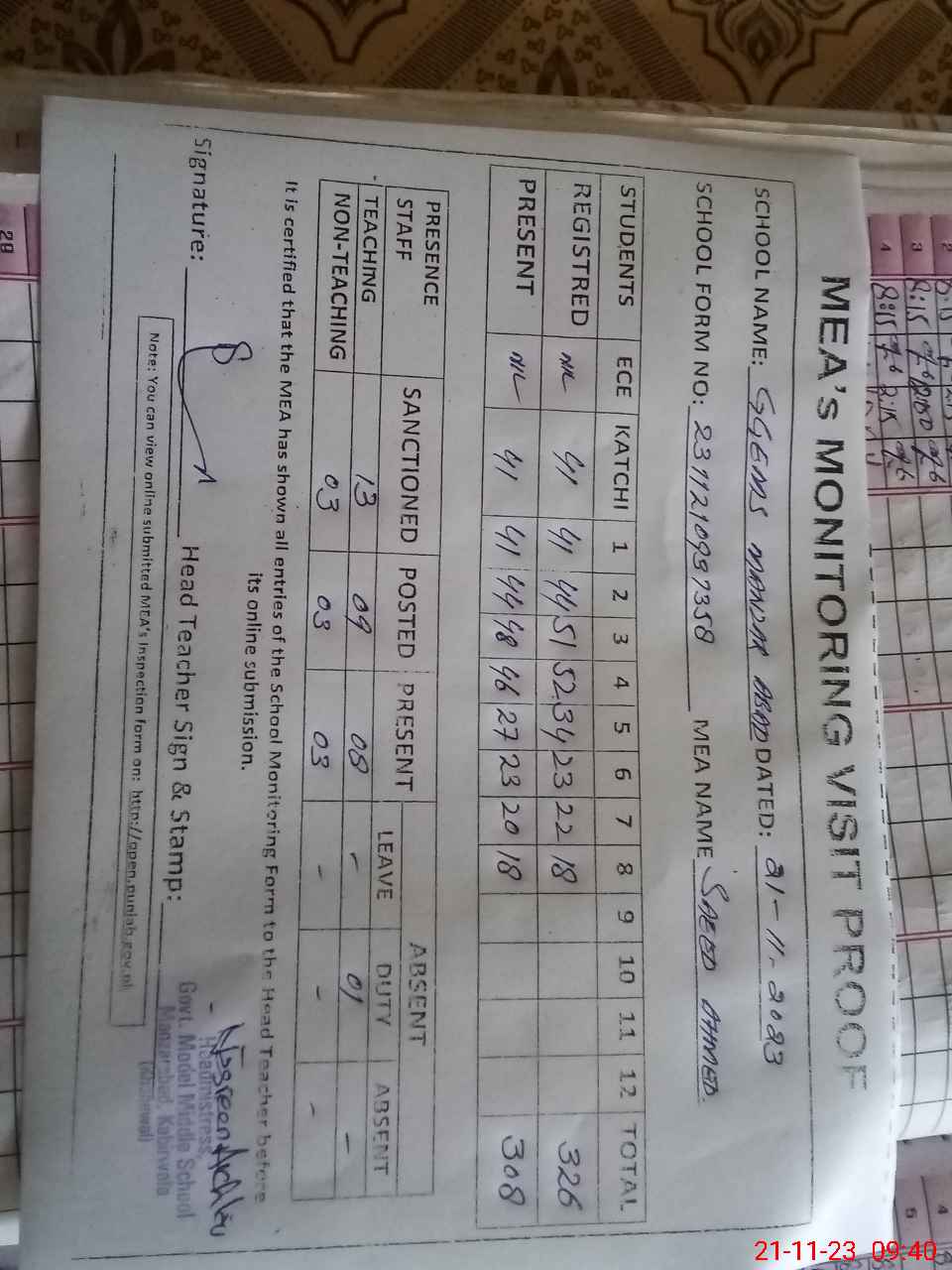 | Attendance Register | Head Teacher | MEA with School | Visit Proof |