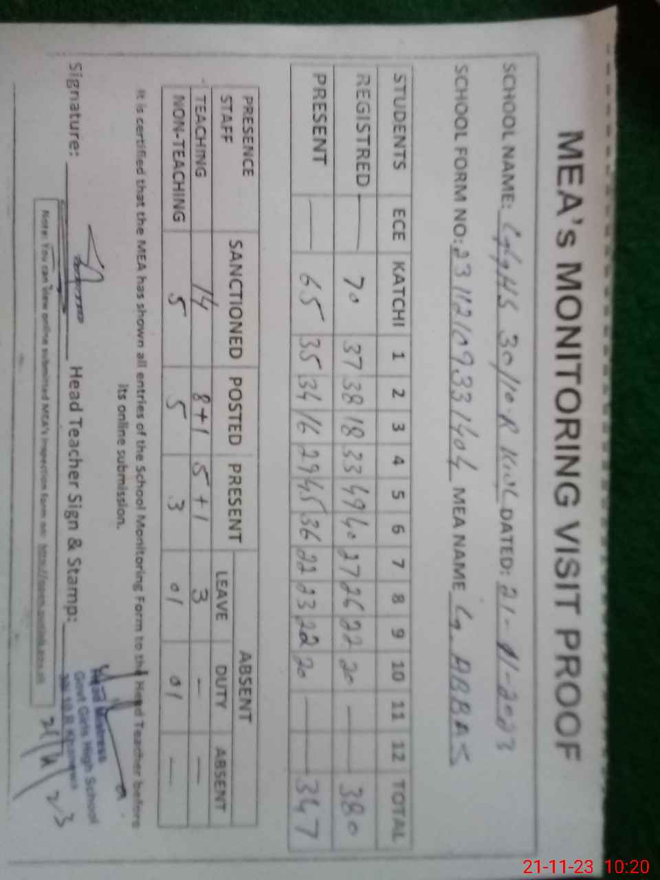 | Attendance Register | Head Teacher | MEA with School | Visit Proof |
