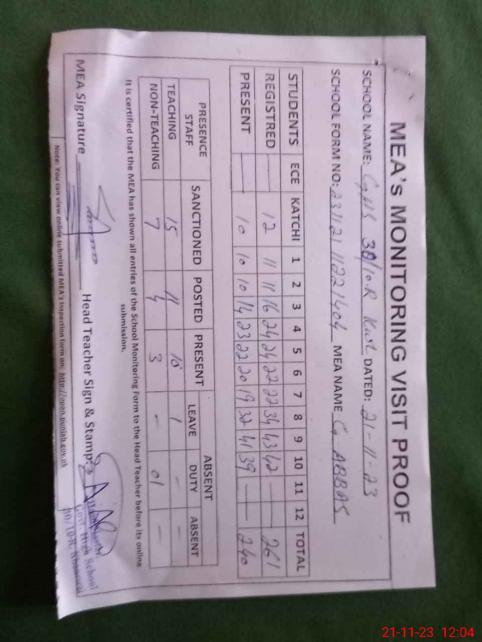 | Attendance Register | Head Teacher | MEA with School | Visit Proof |