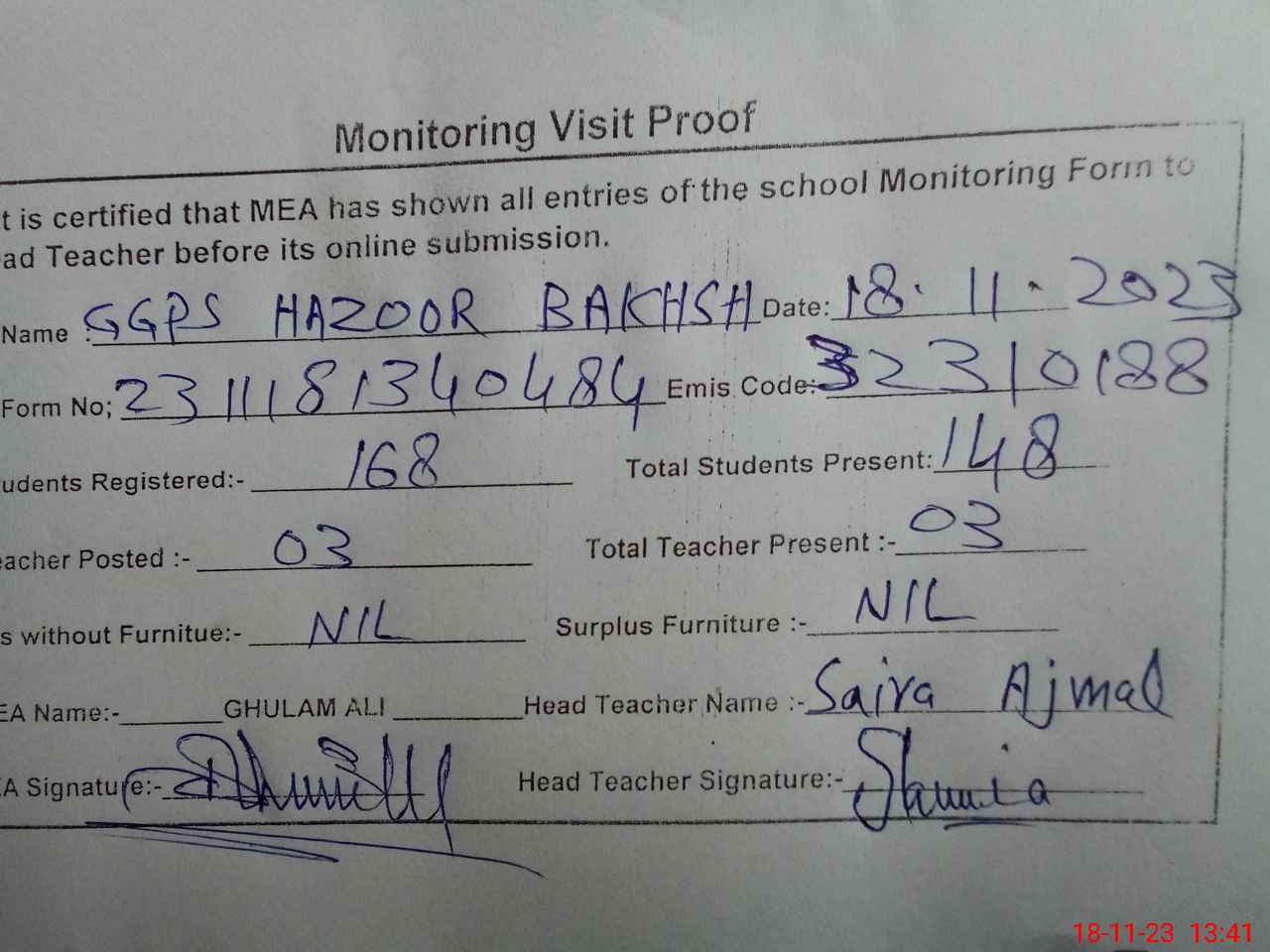 | Attendance Register | Head Teacher | MEA with School | Visit Proof |