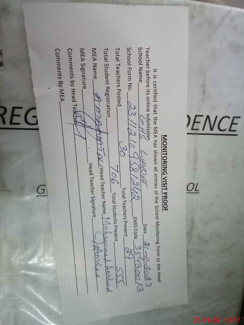 | Attendance Register | Head Teacher | MEA with School | Visit Proof |
